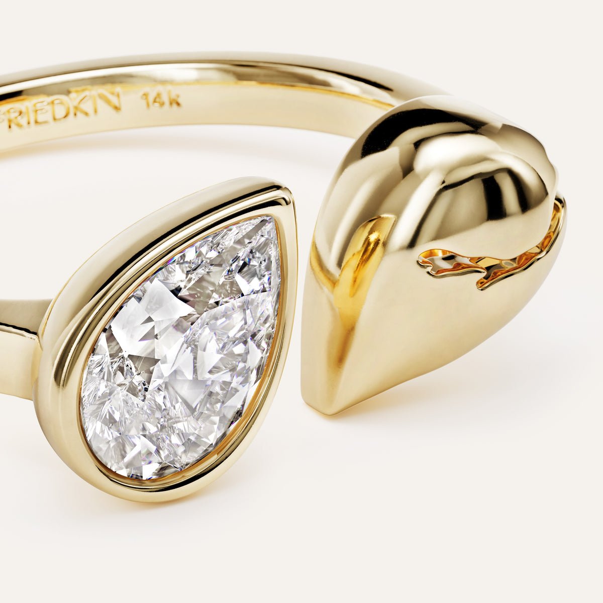 Inspired by timeless elegance with a modern twist, this 14k recycled gold ring showcases a sleek, open-ended design, with a dazzling pear-shaped lab-grown diamond on one end and a smooth, polished 14k gold station on the other end. The open silhouette of the ring creates a sense of fluidity and balance, making it both a statement piece and an everyday essential. Perfect for those who appreciate luxurious design and eco-conscious craftsmanship, this ring exudes sophistication while honoring the planet.