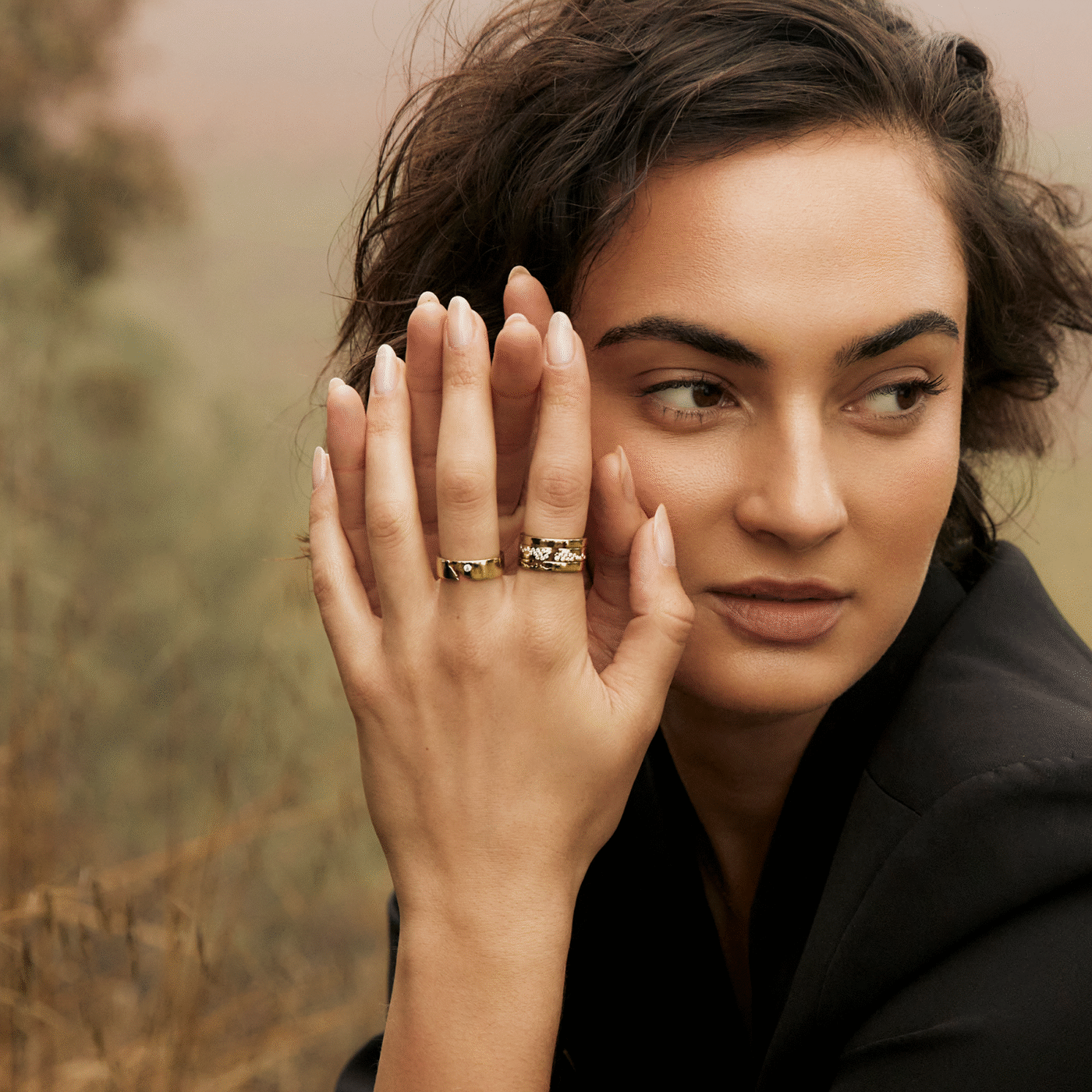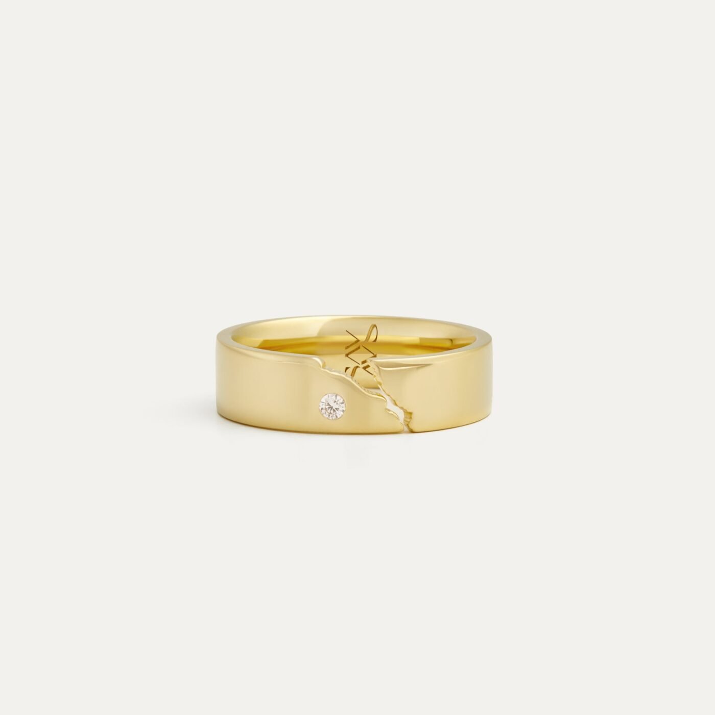 Artfully blend the comfort of a traditional pipe band fitting with a striking, nontraditional element- a distinctive break in the design. The single diamond lying near the crack acts as a symbol of beauty that can be found amongst the shattered. This solitaire diamond has the ability to speak volumes. This wide band ring represents the profound impact of finding a beautiful path forward..